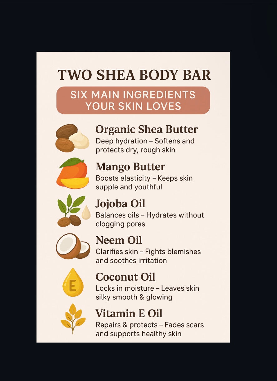 Mango Butter, Organic Shea Butter, Vitamin E, Coconut Oil, Neem Oil, Jojoba Oil, Arrowroot Powder